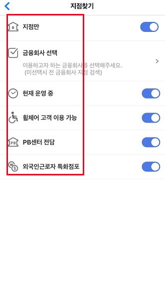메인화면 좌측 상단 'ATM'(파란색 버튼)을 선택하여 ATM조건을 설정하여 지점 없이 ATM만 조회할 수 있으며, '지점'(노란색 색 버튼)을 선택하여 ATM 없이 지점만 조회할 수도 있습니다. 특정 금융회사·운영 여부·휠체어 가능 여부·이용 서비스 등의 설정값에 따라 조회할 수 있습니다.