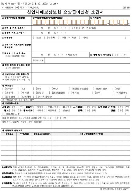 요양급여신청 소견서는 요양급여신청서를 병원에 제출하면 그것을 토대로 의사가 직접 작성해 주기 때문에 근로자(신청인)가 작성할 필요는 없습니다.